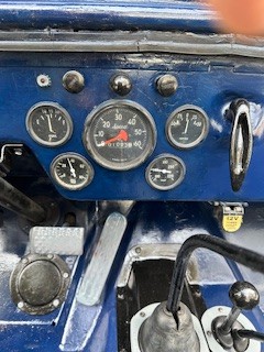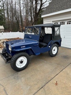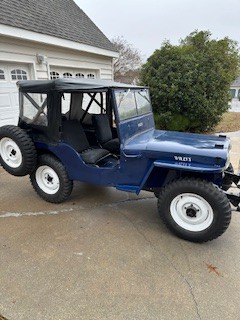 This CJ2A is painted Navy Blue with black/gray trim. There are painting blemishes plus normal wear and tear. Tub off frame rebuild. Mounted spare tire on carrier. Transfer case (high and low) by Spicer. Retained original parts except where safety is concerned. (windshield safety glass, 12v electrical system, taillights, halogen headlights, new brake parts, roll bar).