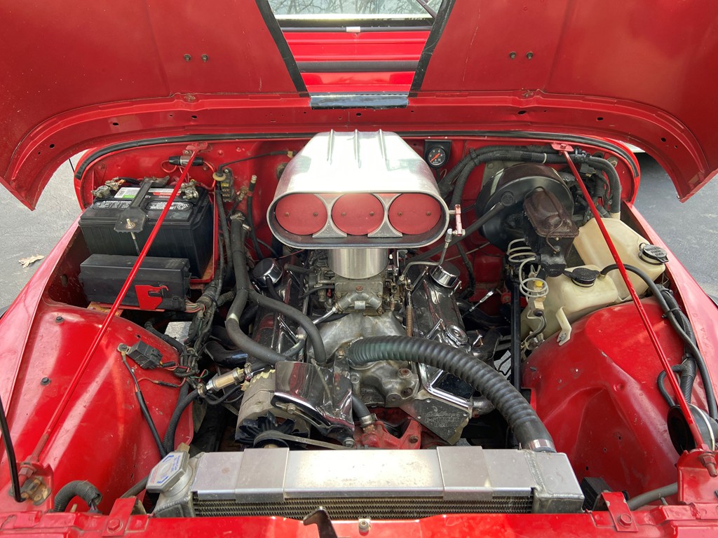 V8 Chevy 350 sbc, bored 0.30 over, 0.120 dome top pistons, aluminum roller rockers, 202 heads (Edelbrock E-Street), Holley carburetor